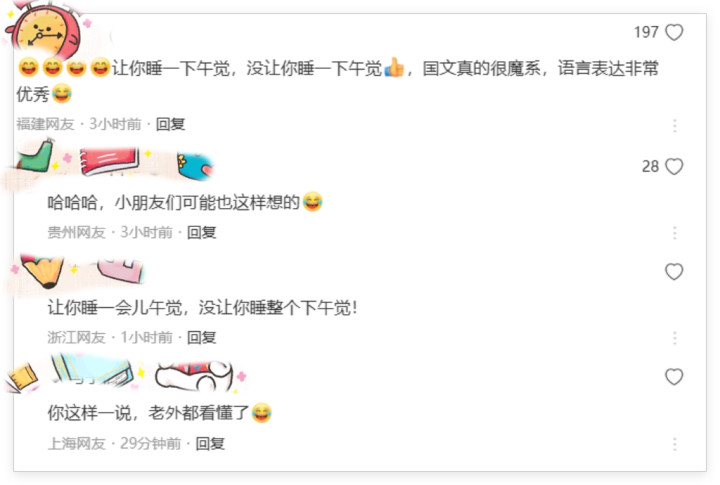 最出圈的评论莫过于这句——“让你睡一下午觉,没让你睡一下午觉”,中国语言文字的博大精深在这一刻体现得淋漓尽致。