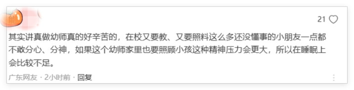 有网友评论说:“做幼师真的好辛苦的,在校又要教、又要照料这么多还没懂事的小朋友,一点都不敢分心分神,所以在睡眠上会比较不足。”
